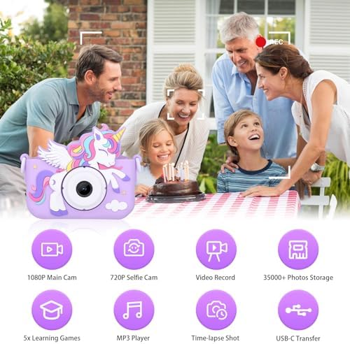 This purple unicorn-themed camera, designed for Daughters’ Day, is a heartfelt gift from parents to daughters aged 3-8, featuring 1080P HD video, a 32GB SD card, and fun features for creative exploration.