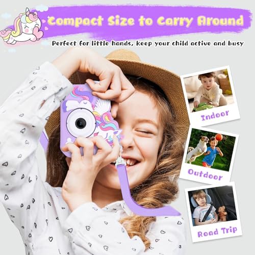 The Envyvip Unicorn Kids Camera is a charming gift from parents to daughters aged 3-8, perfect for Daughters’ Day, birthdays, or Christmas. This purple toddler camera, equipped with a 12-megapixel 1080P main camera and a 720P selfie camera, captures clear photos and videos, encouraging kids to explore their world.