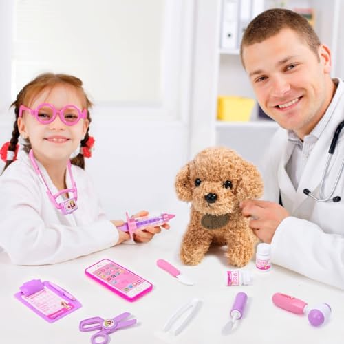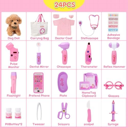 - Included Components: Plush Dog Toy, Doctor Coat, Hat, Carrying Bag, Stethoscope, Syringe, Thermometer, Tweezers, Tray, Dental Mirror, Hammer, Scissors, Eyeglasses, Otoscope