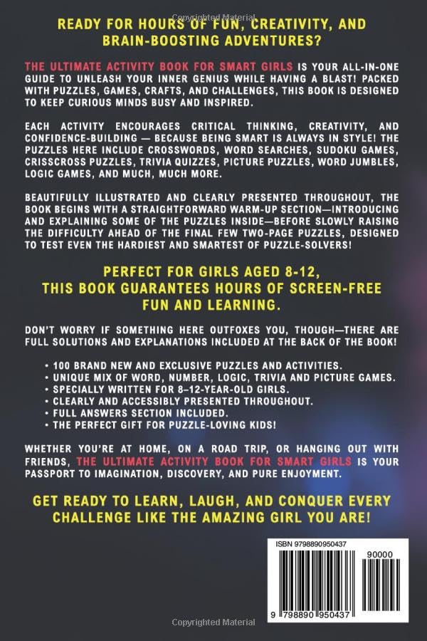 The Ultimate Activity Book for Smart Girls is a thoughtful gift from parents to daughters aged 8-12, perfect for Daughters’ Day, birthdays, or holidays. Packed with 100 exclusive activities, including sudoku, word searches, trivia, logic puzzles, and crafts, this paperback book fosters critical thinking, creativity, and confidence.